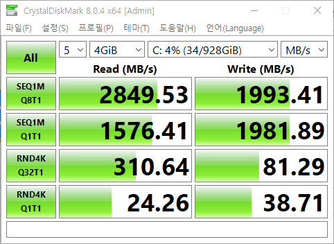 레이드 구성중 벤치한거라서 실제 성능은 10~20%정도 더 높을거라 생각합니다.